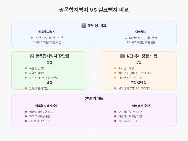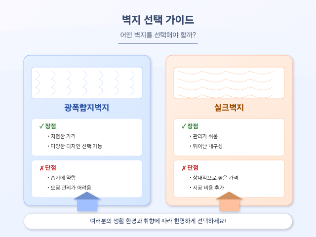 광폭합지벽지는 저렴한 가격과 디자인 다양성이 매력적이지만 습기와 오염 관리가 어렵다는 단점이 있어요. 실크벽지는 관리가 쉽고 내구성이 뛰어나며 고급스러운 인테리어 효과를 줄 수 있어 오랜 기간 사용하기에 적합합니다. 두 벽지의 특성을 잘 파악하고 여러분의 생활 환경과 취향에 따라 현명하게 선택해 보세요.