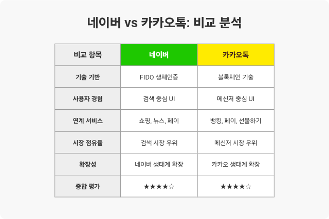 | 보안성 | FIDO2 및 블록체인 기반 보안 | 카카오페이 인증과 연동 |