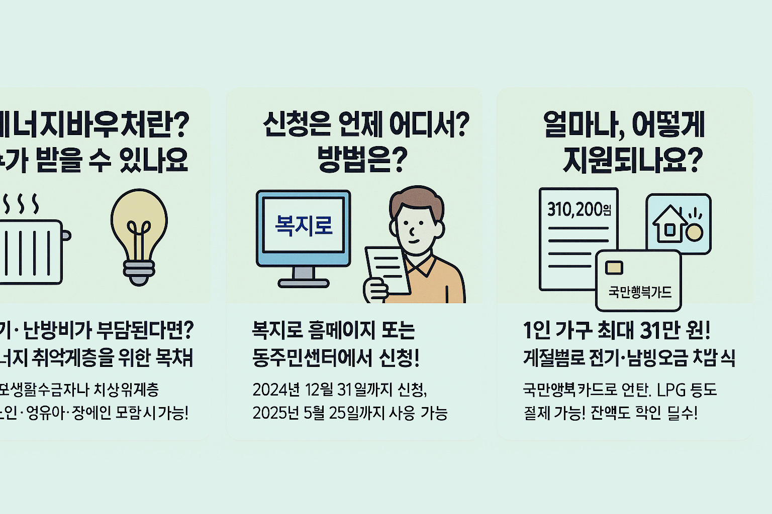 에너지 취약계층을 위한 정부 지원, 에너지바우처에 대해 자세히 알아볼까요? 신청 조건부터 방법, 지원 금액, 사용 범위, 잔액 관리까지 모든 궁금증을 해결해 드릴게요!